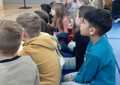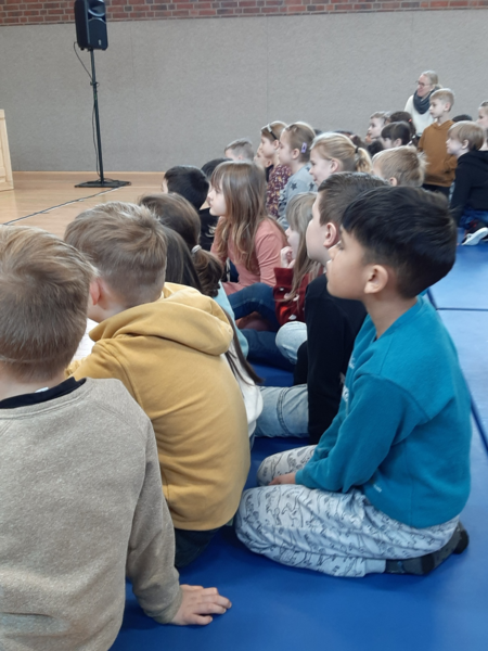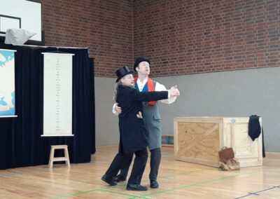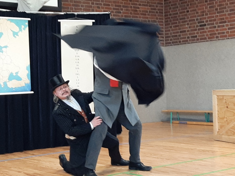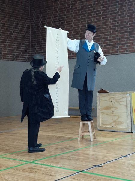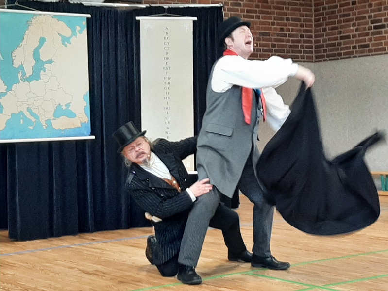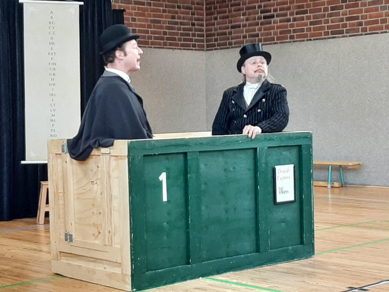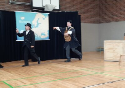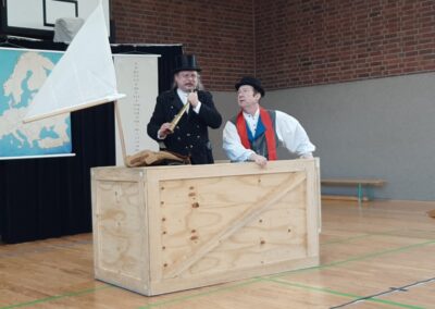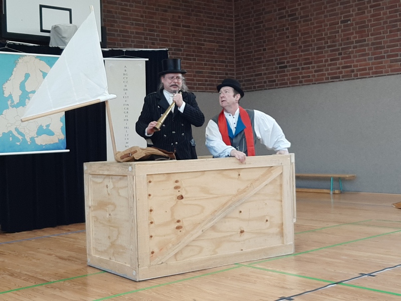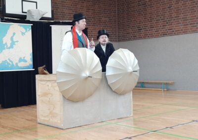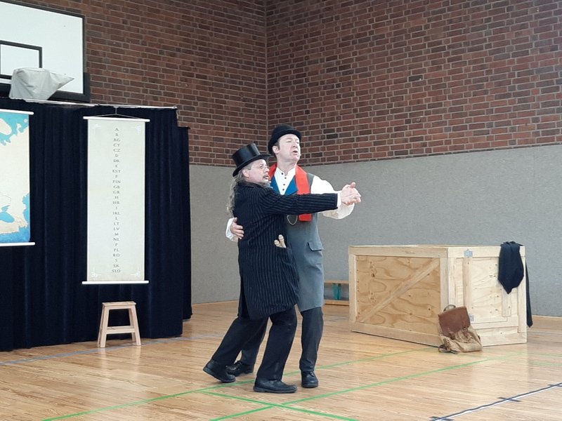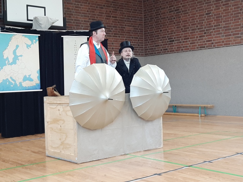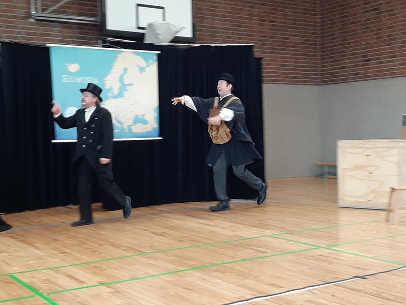 Wie gewohnt gab es zwei Aufführungen in der Turnhalle. Zur ersten Aufführung begaben sich die Zweit- und Viertklässler in die Halle, zur zweiten durften sich Erst- und Drittklässler dort versammeln. Gezeigt wurde eine Fortführung des bekannten und in verschiedenen Formen schon verfilmten Romans „In 80 Tagen um die Welt“ von Jules Verne. Phileas Fogg und sein französischer Diener Jean Passepartout (gespielt von Frank Dukowski und Marcell Kaiser) lassen sich nach der Behauptung „Wer Europa nicht kennt, der kennt die Welt nicht!“ im Reformklub auf eine neue Wette ein und begeben sich wieder auf eine Reise, diesmal mit den verschiedensten Verkehrsmitteln quer durch Europa. Mit viel Spaß, guter Laune und großartiger musikalischer Unterstützung durch das Pindakaas-Quartett erfuhren die Kinder viel über die verschiedenen Einigartigkeiten europäischer Länder.