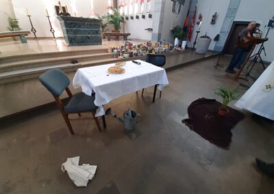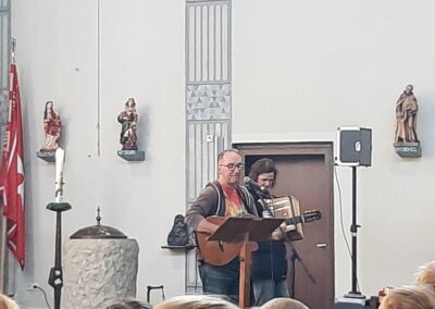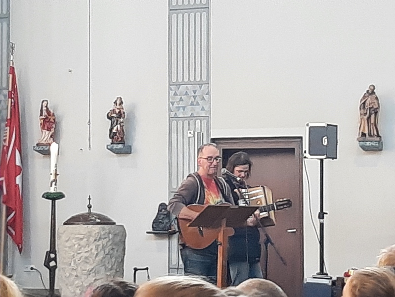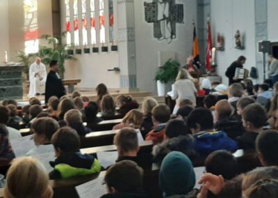 Am 30.09.2022 wollten wir den „Erntedankfestgedanken“ etwas intensiver aufgreifen und haben uns den ganzen Tag damit beschäftigt. Der Tag begann mit einem langen Zug aller Schüler zur St. Barbara-Kirche, wo wir gemeinsam einen Erntedankgottesdienst feiern wollten. Jedes Kind trug eine Spende für die Castroper Tafel bei sich, wobei die eine oder andere Spende den Weg zur Kirche nicht ganz geschafft hat. Die Viertklässler hatten einen tollen Gottessdienst vorbereitet und führten ein kleines Stück auf, das zum Nachdenken anregte. Musikalisch unterstützt wurden wir von Herrn Ronge mit der Gitarre und Frau Ludwig mit dem Akkordeon. Als alle Kinder ihre Spenden nach vorne brachten, entstand ein wirklich eindrucksvolles Bild.