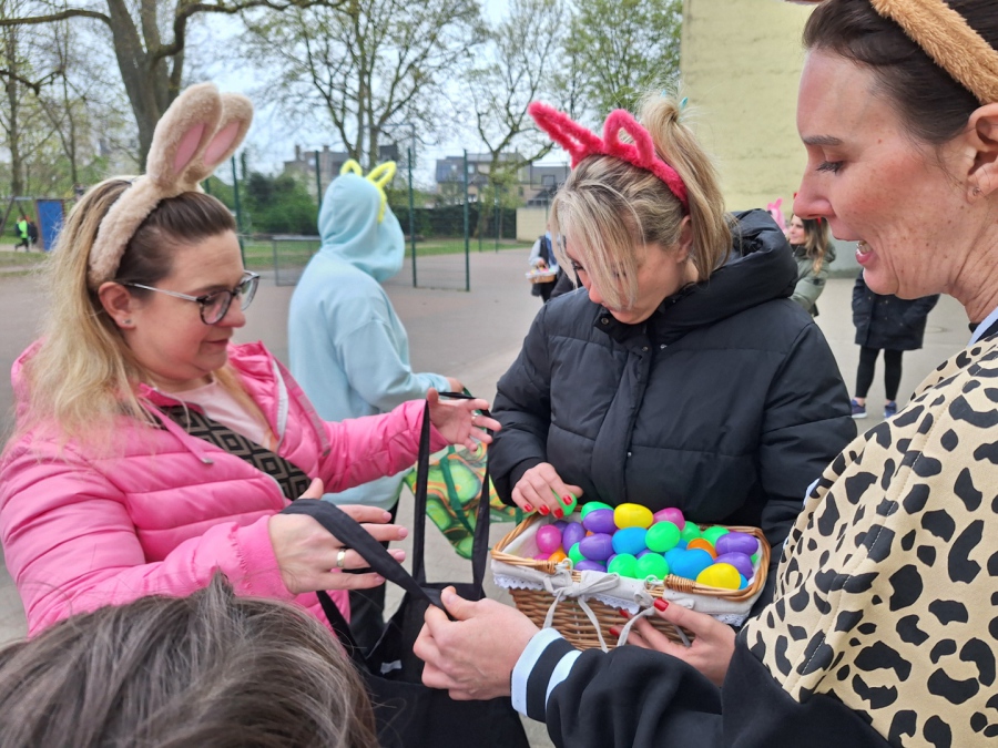 In diesem Jahr hatten wir mehr Glück mit dem Wetter. Es schien zwar nicht die Sonne, aber es regnete diesmal auch nicht so heftig wie im letzten Jahr. Viele fleißige, hübsch verkleidete, Eltern hatten für jede Jahrgangsstufe Plastikostereier auf dem Schulgelände versteckt. Der erste Jahrgang durfte beginnen. In einer vorgegebenen Zeit liefen die Kinder los und brachten alle versteckten Eier zurück. Gewonnen hatte die Klasse mit den meisten Eiern, aber der Spaß sollte natürlich im Vordergrund stehen. Jedes Kind erhielt als Belohnung eine kleine Osterüberraschung!