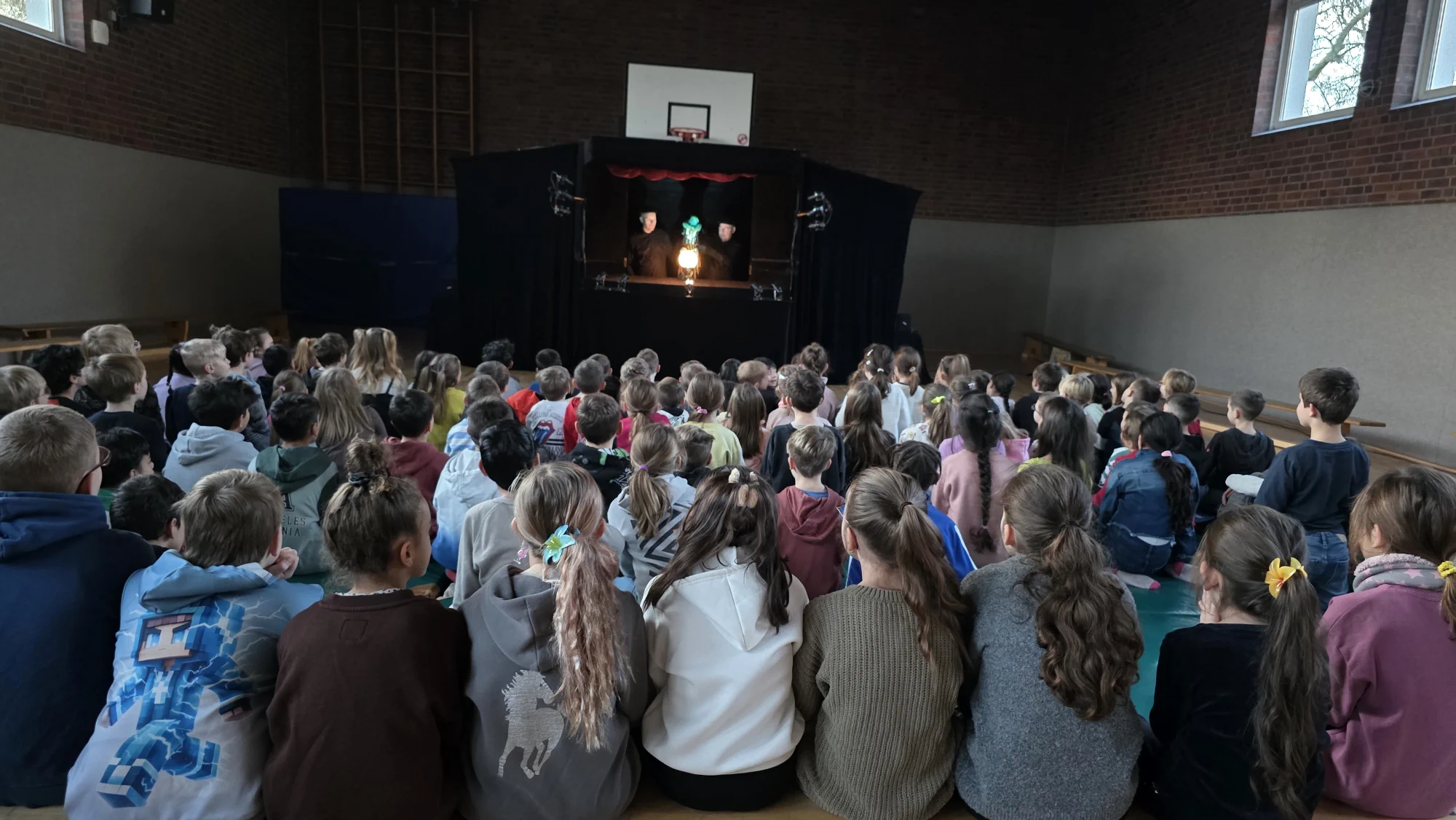 Ein besonderes Theatererlebnis konnten die Kinder und Lehrkräfte am 16.12.2025 bei uns in der Turnhalle erleben: Die Niekamp Theater Company brachte das bekannte Märchen „Aladdin und die Wunderlampe“ als liebevoll inszeniertes Puppentheater auf die Bühne.