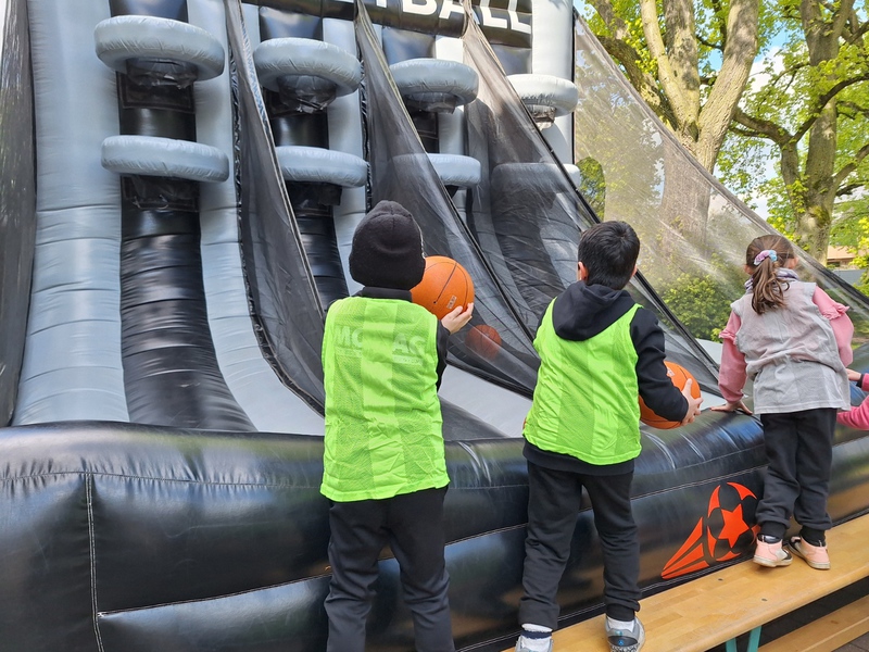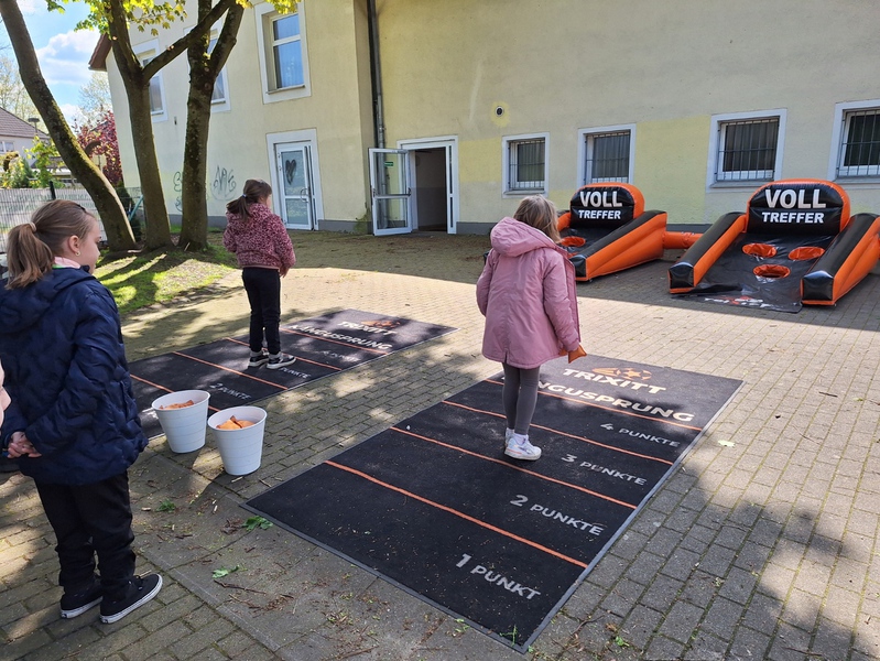 Die Neugierde steigerte sich beim Aufbau der einzelnen Stationen nur noch mehr. Aufgeregt bestaunten die Kiner, wie die viele Geräte durch Luftzufuhr an Größe gewannen, und versuchte, mögliche Spielideen dafür zu entwickeln. Gegen 9 Uhr konnten wir dann endlich mit einer gemeinsamen Begrüßung auf dem Schulhof starten. 2100 Gesamtpunkte mit allen Schülerinnen und Schülern zu erreichen, das sollte unser Tagesziel sein. Dazu konnte noch eine Klasse eine „Fairness-Sonderpreis“ erhalten. Das reichte als Motivation und die Kinder „stürzten“ sich begeistert auf die ersten Stationen, um gemeinsam Punkte zu ergattern. In den nächsten Stunden konnten sie sich beim Kängurusprung, Hindernislauf, Zweifelderball, Basketball, Menschenkicker, Staffellauf und beim Fußball in der Halle beweisen, erproben und austoben.