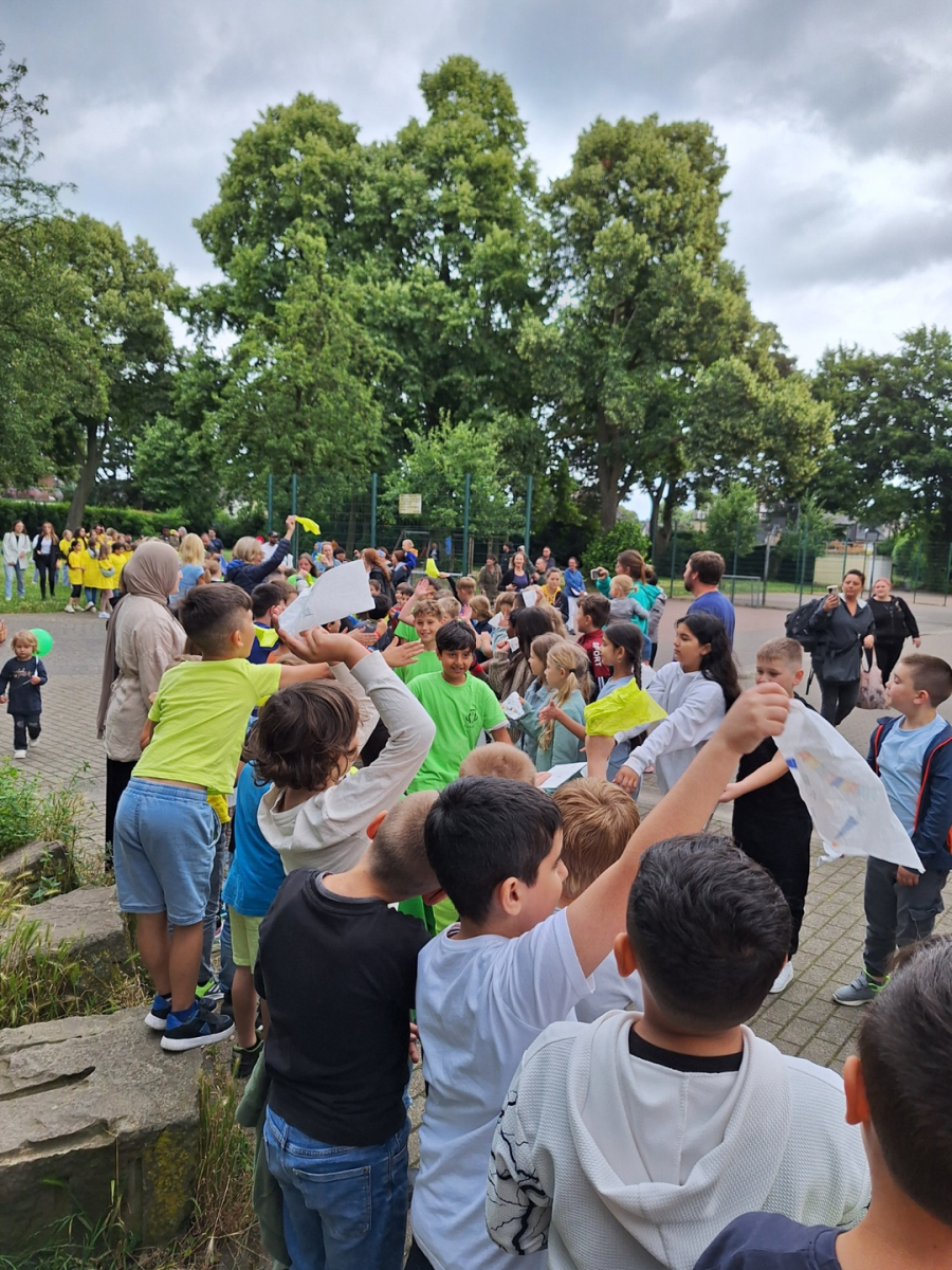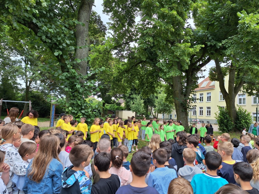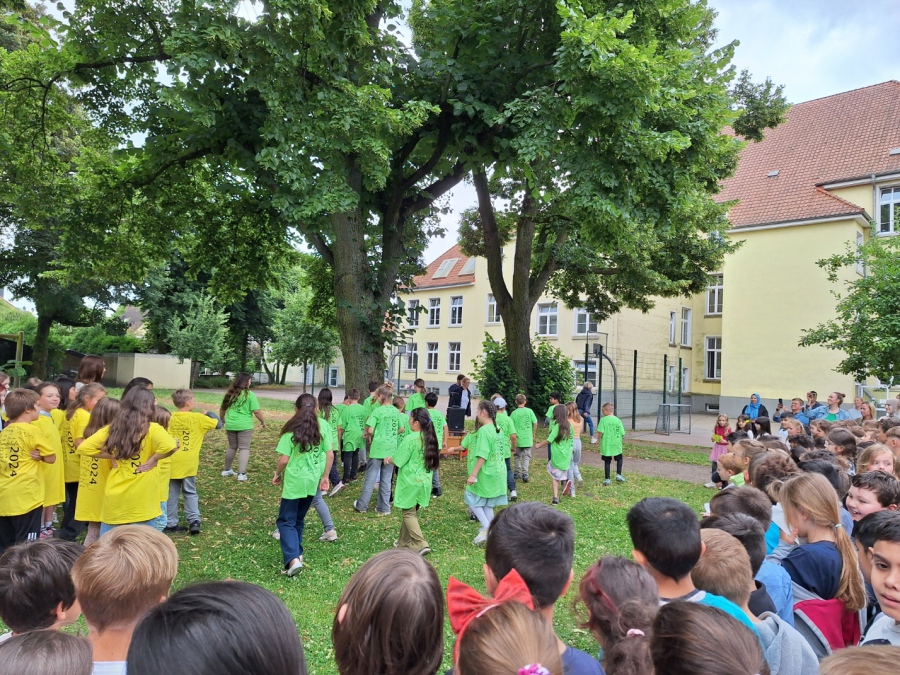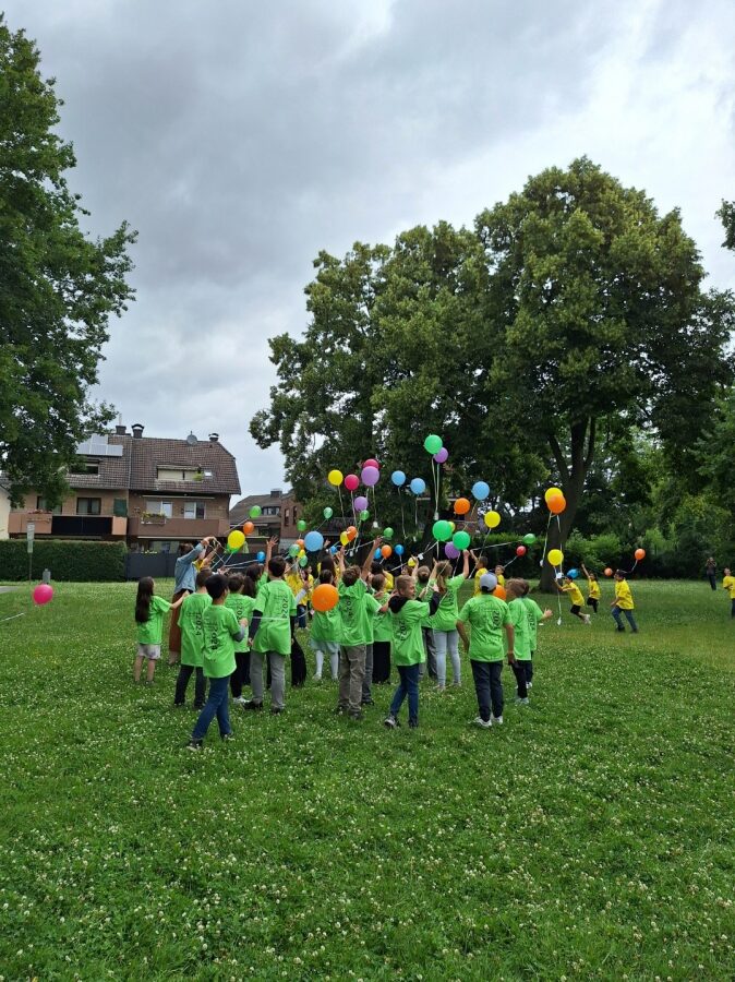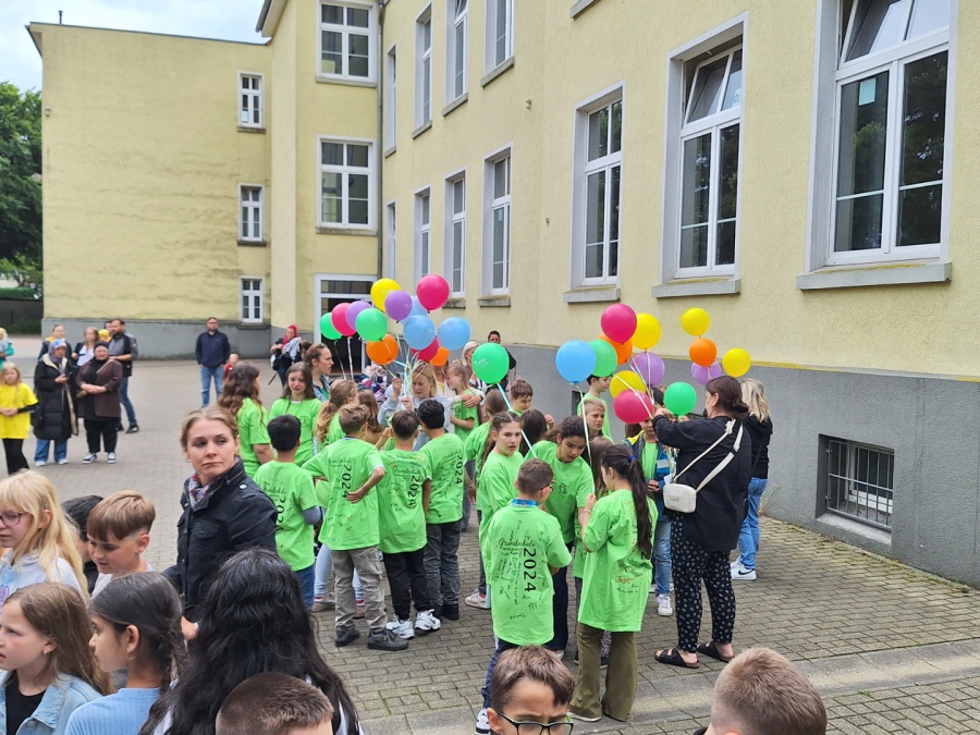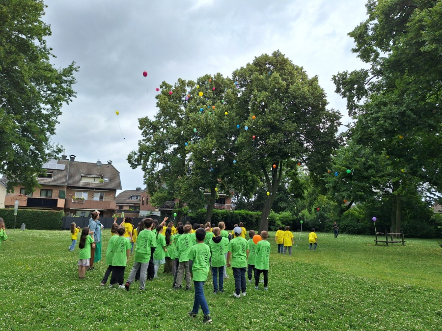 Und schon wieder stand ein Abschied bevor: die Eichhörnchen und Eulen verlassen uns und starten nach den Sommerferien an den neuen Schulen. So trafen sich in der dritten Stunde alle Schüler und Schülerinnen auf dem Schulhof. Gekleidet in gelben und grünen T-Shirts trugen die Viertklässler ein Gedicht, Tänze und das Lied „Komet“ vor. Die Eltern brachten noch Luftballons mit, die mit Wünschen bersehen in den Himmel geschickt wurden. Zum Schluss bildeten alle anderen Kinder ein Spalier, durch das die Viertklässler beim Lied „Alte Schule, altes Haus“ liefen. Hier ließen sich die ersten Tränen nicht mehr zurückhalten.