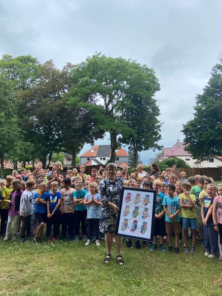 Wir versammelten uns also auf dem Schulhof und die Klassen überreichten Frau Kentner gemalte Buscheulen und Glückwünsche für die freie Zeit nach der Schule und viele Blumen. Die Klasse 2a führte einen Tanz auf und die ganze Schule tanzte den Flashmob-Tanz zu dem Lied „I’m happy“ mit.